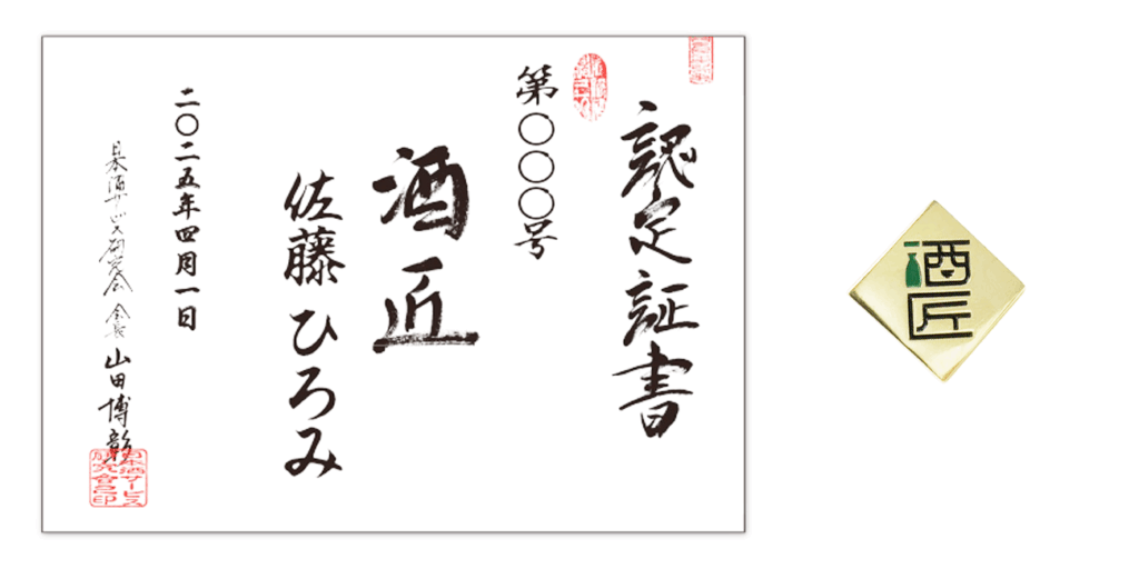合格時の認定お手続き完了後、「酒匠」の証として、認定証書、認定章が授与されます。